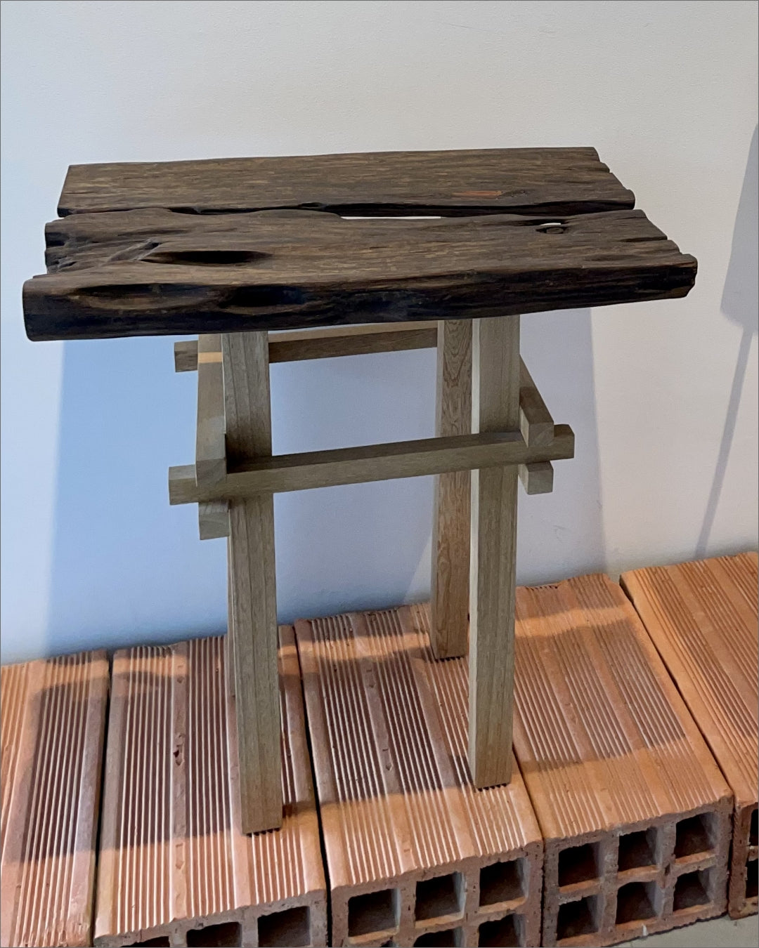 En esta mesa, dos tablones forman un diálogo y allí un encuentro que a su vez es vacío. Allí las curvas se miran, casi se sienten, pero nunca se tocan. Están conectadas a través de la estructura que las mantiene flotando en esa encrucijada. Allí la madera se fusiona y se separa. La madera oscura, de la playa muestra bien el paso del tiempo. Nos recuerda el agua, los arroyos, los ríos, ese río por el que seguramente viajó antes de tocar el mar para nosotros encontrarla de nuevo en la playa.